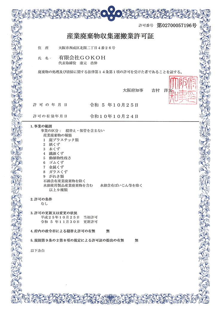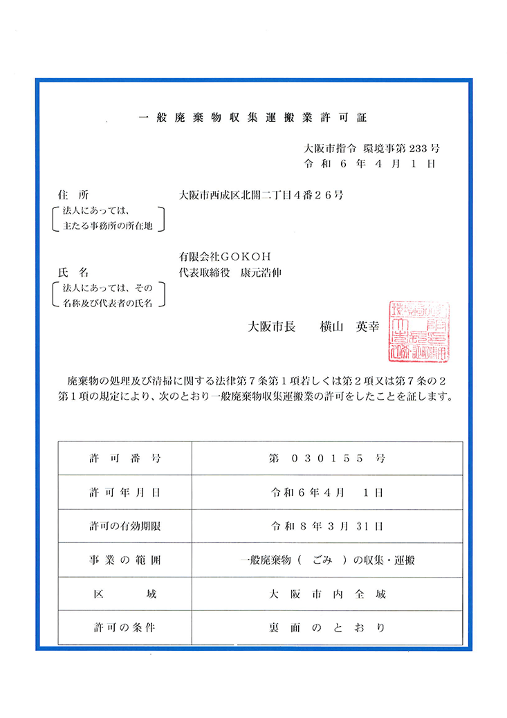 有限会社GOKOHは、大阪市の許可を受けた
